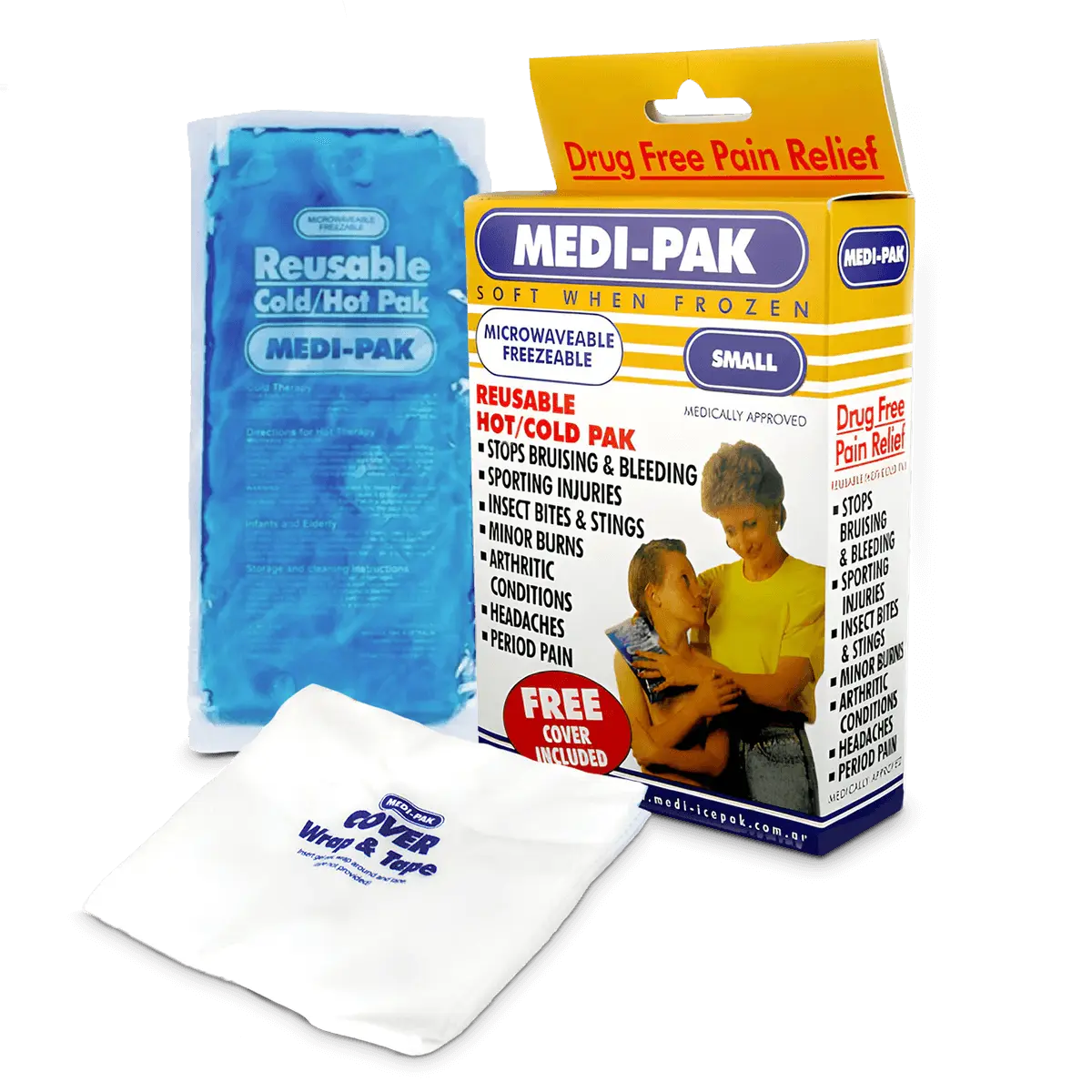 Apply Medi-Pak cold for the relief of headaches, migraines, burns, scalds, toothache, insect bites, R.S.I. pain, muscle aches and sprains, tennis elbow, nose bleeds, prickly heat and most sporting injuries. Medi-Pak can be used as a hot pack for the relief of backache, tense muscles and arthritic conditions and period pain.