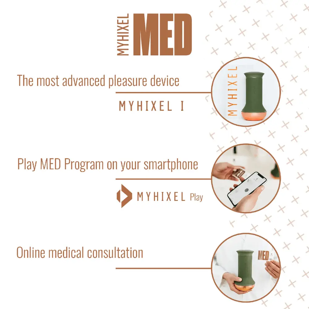 The Play MED program is activated within the MYHIXEL Play app. It allows men to learn how to control the physical and mental aspects involved in climaxing, and therefore to delay the ejaculatory reflex, allowing them to have longer-lasting sex. This programme of activities, guided and developed by our team of sexologists, is put into practice in combination with the MYHIXEL I device. The activities of MYHIXEL MED are continuously adapted to the results and needs of the user. MYHIXEL Play is an anonymous and secure app to protect your privacy and is available on the App Store and Google Play.