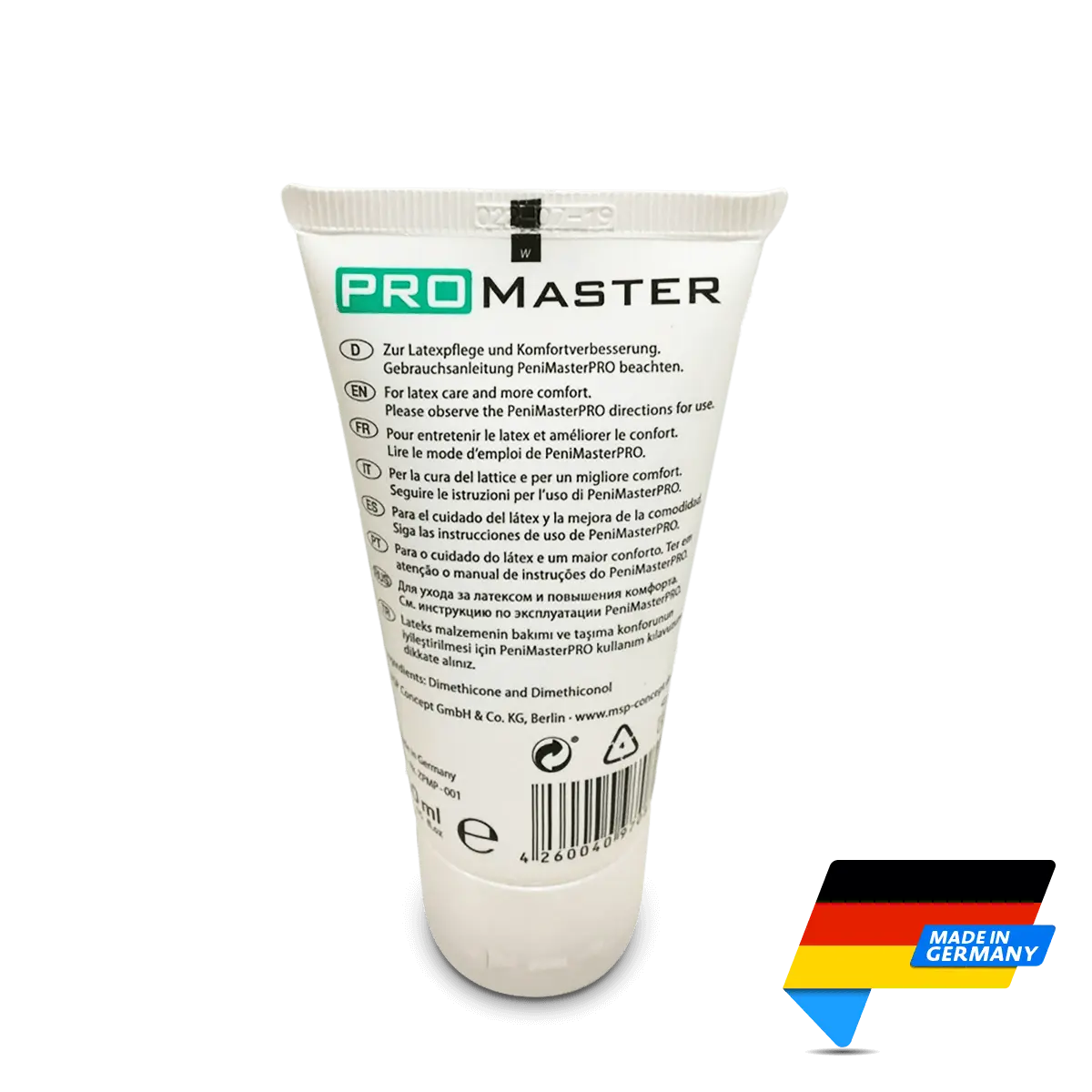 ProMaster Comfort & Care is a gliding oil adapted for PeniMaster PRO with a viscosity that is ideal for the application providing for maximum adhesion between adaptive diaphragm and glans and, thus, further increasing the fixing force of the penis expander. The thin film of liquid facilitates the application of PeniMaster PRO and maximises the wearing comfort, because skin and latex remain mobile regarding each other and this way “latex pinching” known from rubber gloves is prevented. As a special care agent, ProMaster Comfort&Care keeps the latex parts soft and smooth, whereby diaphragmsand sluices of PeniMaster PRO can be used for up to ten days without replacement. ProMaster Comfort & Care is extremely yielding as it practically is not drawn in. Just a few drops are sufficient; the contents of one tube (50ml) are sufficient for up to hundred applications of PeniMaster PRO. ProMaster Comfort & Care is hygienic, skin-friendly, and not sensitising. The tasteless and odourless gliding oil is colourless, can be wiped easily off the skin, and can be washed off clothes easily, for example. Within the sealed dispensing tube with leakage protection, ProMaster Comfort & Care can be stored for a virtually unlimited period of time and can be used for at least twelve months after it was opened. Product advantages:- facilitates the application of PeniMaster PRO