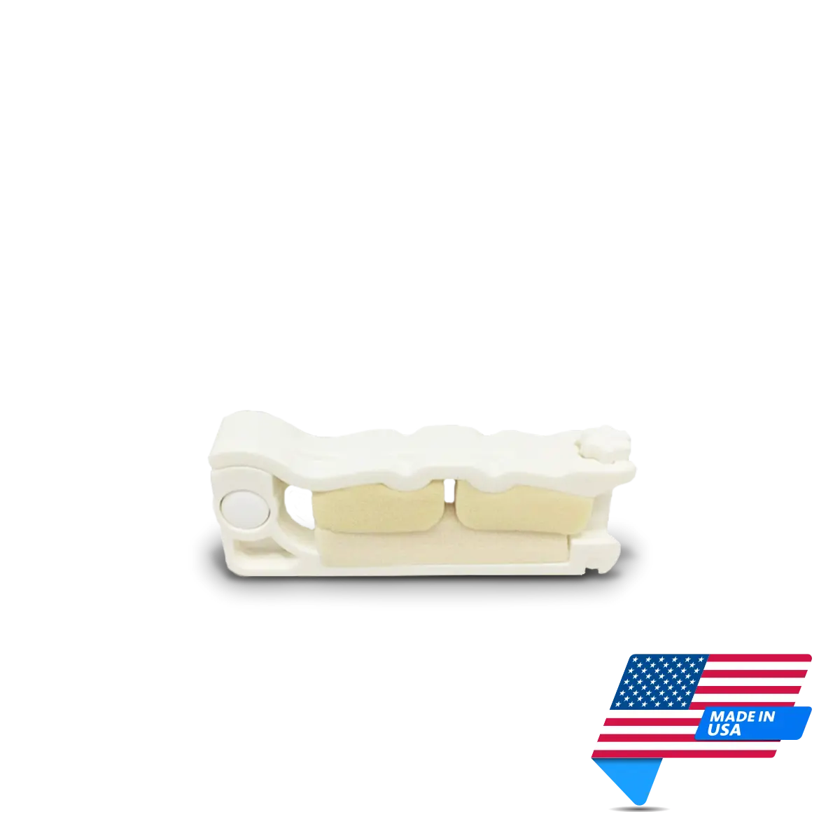 It works because of the double bumps! Under the centerline of the top surface of the penis are four delicate veins, arteries and two nerves we call the “central vascular group.” The foam lined “double bumps” on the top arm of the Squeezer™ straddle the central vascular group and press down and inward onto the penis. The foam covered ridge on the lower arm of the Squeezer™ presses upward against the penis and easily closes the urethra, stopping urine flow. Because the central vascular group has not been compressed, it continues to supply nourishing blood to the penis. The result is remarkable comfort and leakage control.