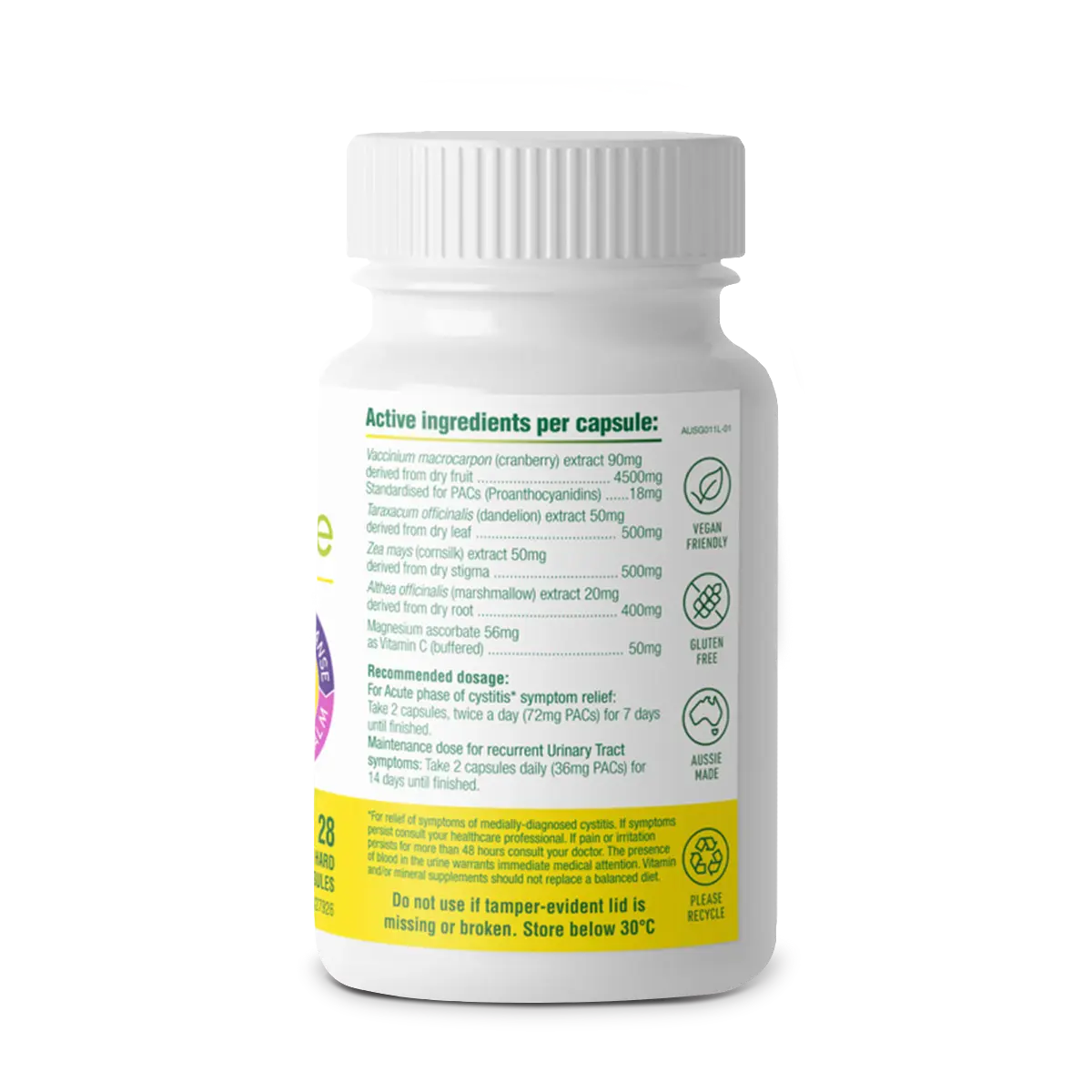 Cranberry 90mg (Vaccinium macrocarpon) derived from fruit 450mg, Standardised for PACs ( Proanthocyanidins) 18mg, (Taraxacum officinalis) 50mg derived from dry leaf 500mg,