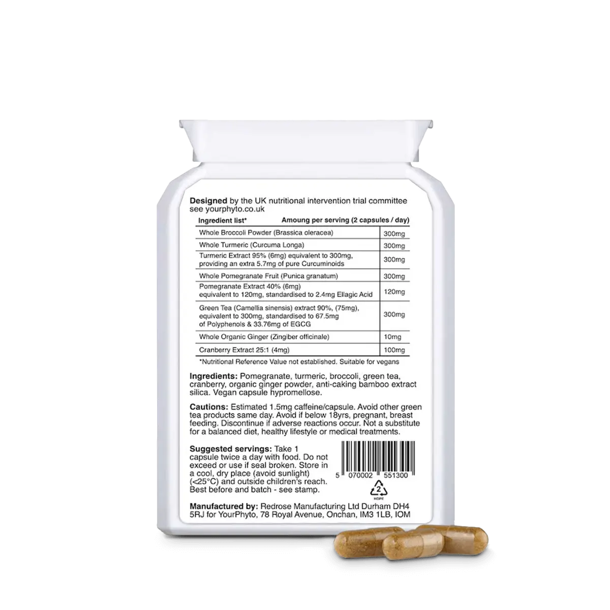 Contains only phytochemical-rich plants and organic ginger in a vegan capsule.